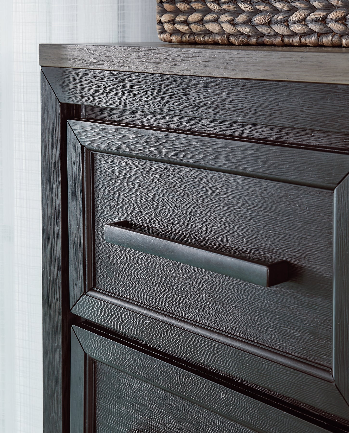This dresser and mirror set is casual contemporary style simply done right. Its two-tone color scheme features a rich brushed black main color accented with a beautiful dusty grayish brown wood tone. With 11 soft-close drawers (three located neatly behind each door) the dresser offers plenty of storage to accommodate your wardrobe needs with ease.