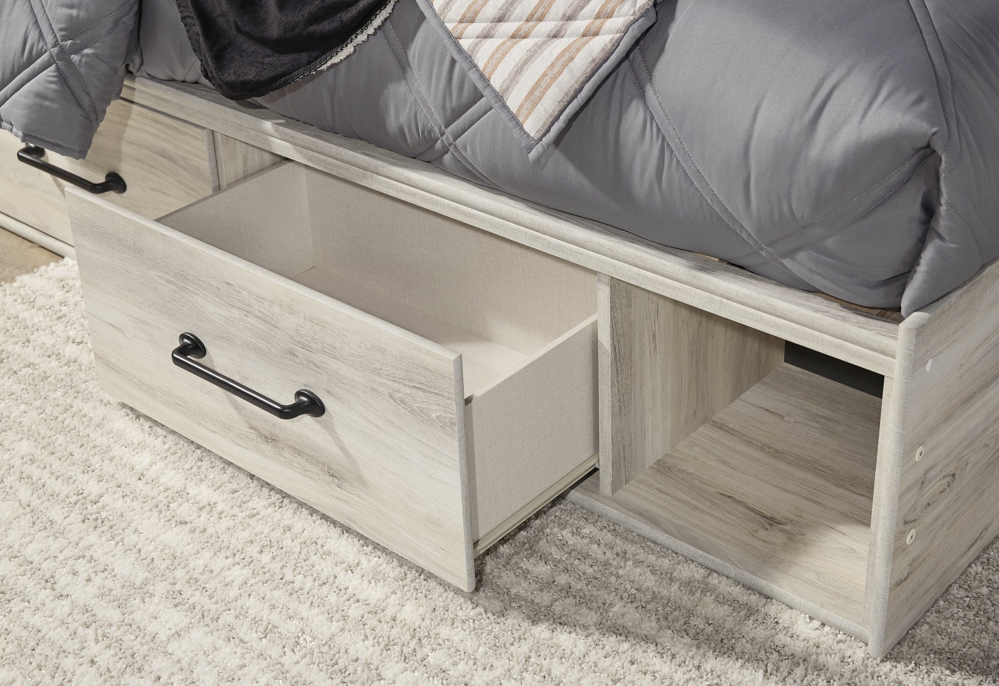 | Details | B192B1: Includes dresser with mirror, Made of engineered wood (MDF/particleboard) and decorative laminate, Wispy white finish over replicated oak grain with authentic touch, 6 smooth-gliding drawers, Drawer interiors are lined with a faux linen laminate for a clean, finished look, Large-scale hardware with dark finish, Mirror attaches to back of dresser, Assembly required, B192B21: Includes headboard, footboard, side storage, rails and slats, Made of engineered wood (MDF/particleboard) and decorative laminate, Wispy white finish over replicated oak grain with authentic touch, Large-scale hardware with dark finish, Decorative sconce light, LED with 3 AA batteries, 4 smooth-gliding storage drawers, 4 storage cubbies, 2 slim-profile USB charging ports, Power cord included; UL-listed, Bed does not require additional foundation/box spring; accommodates most zero clearance adjustable bases with the addition of a bunkie board, Mattress available, sold separately, Assembly required, | |